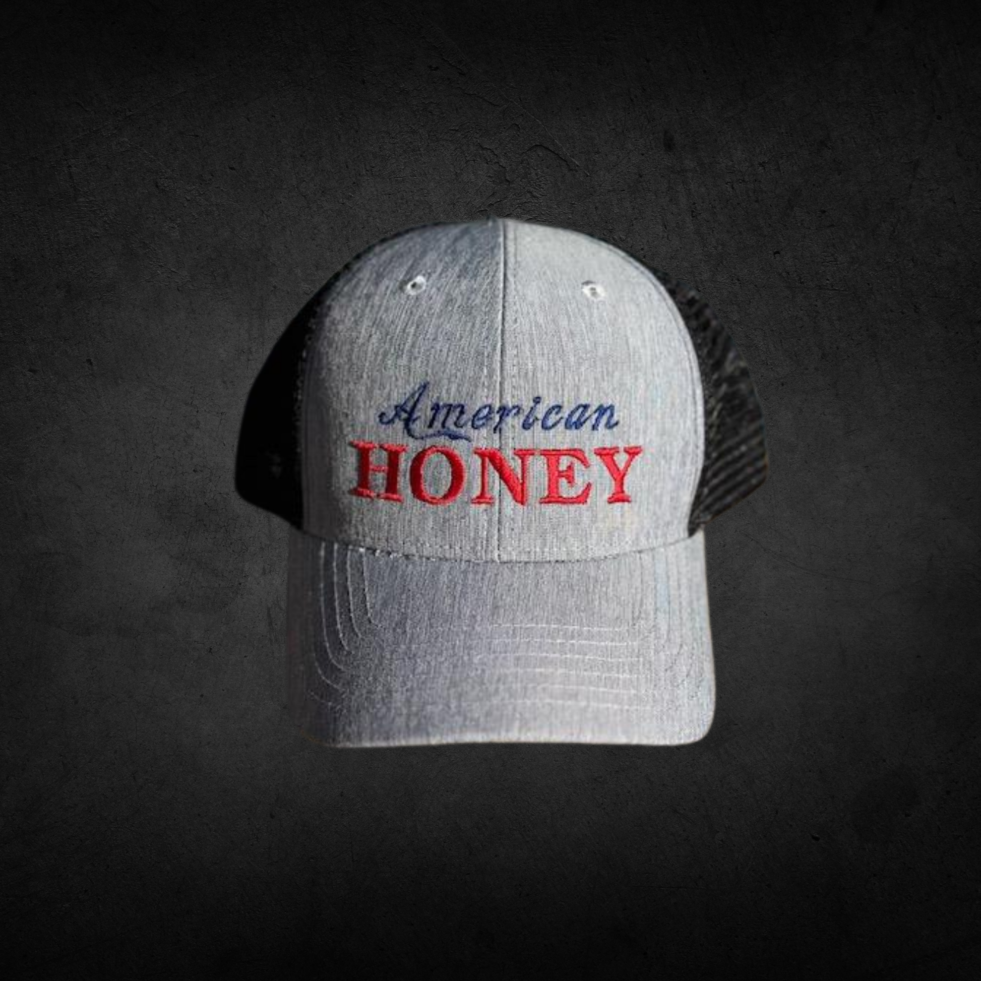 Crafted with a soft heathered front and bold embroidered lettering, this hat makes a statement: patriotic, playful, and unapologetically feminine. The word American is stitched in a timeless navy script, while HONEY pops in vibrant red—because you're both sweet and strong.