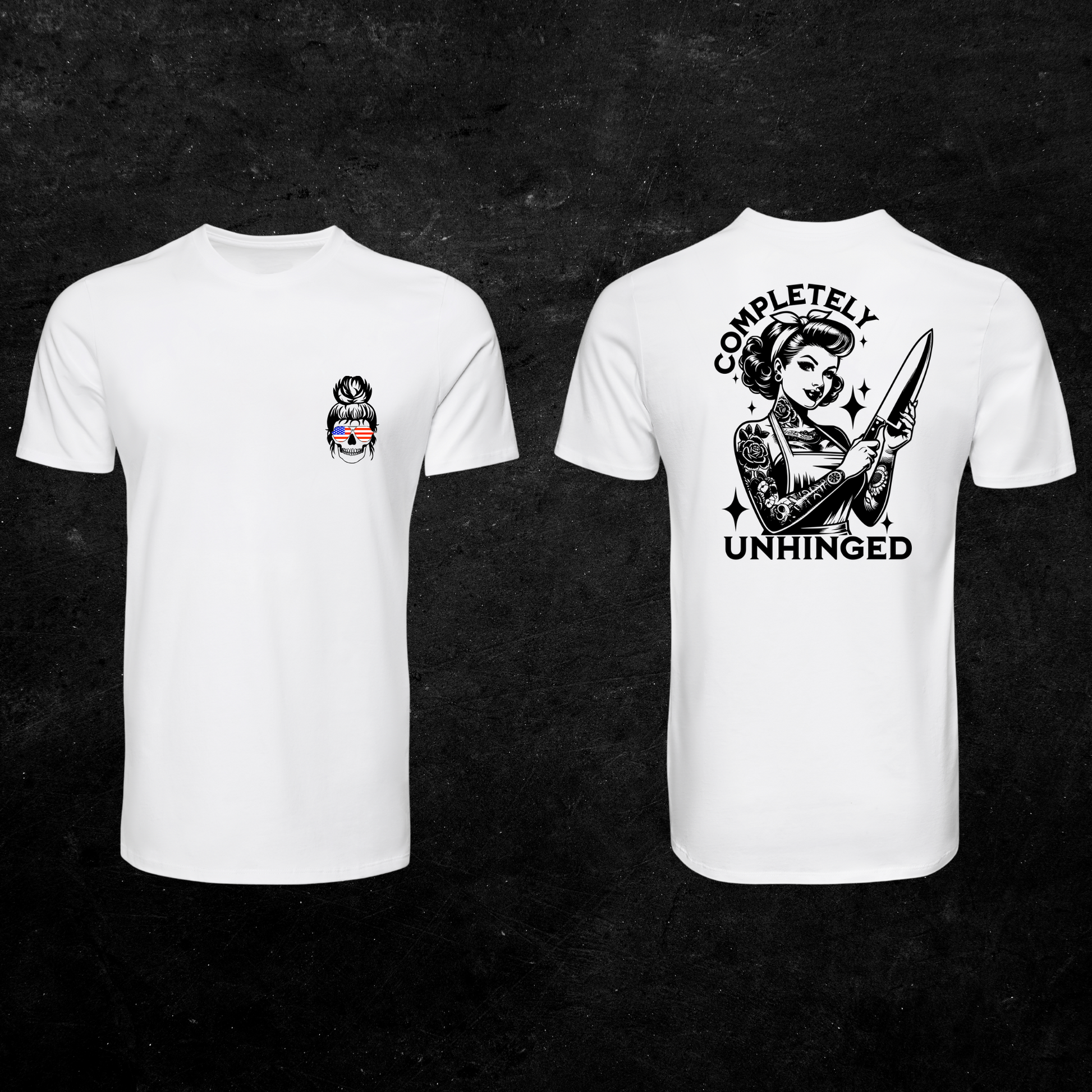 Unapologetically bold, a little dangerous, and totally in control—that’s the energy this tee brings. Featuring a fierce, tattooed pin-up gripping a missile like a lipstick tube, the “Completely Unhinged” tee is for the women who own their chaos, channel their power, and never play small.
